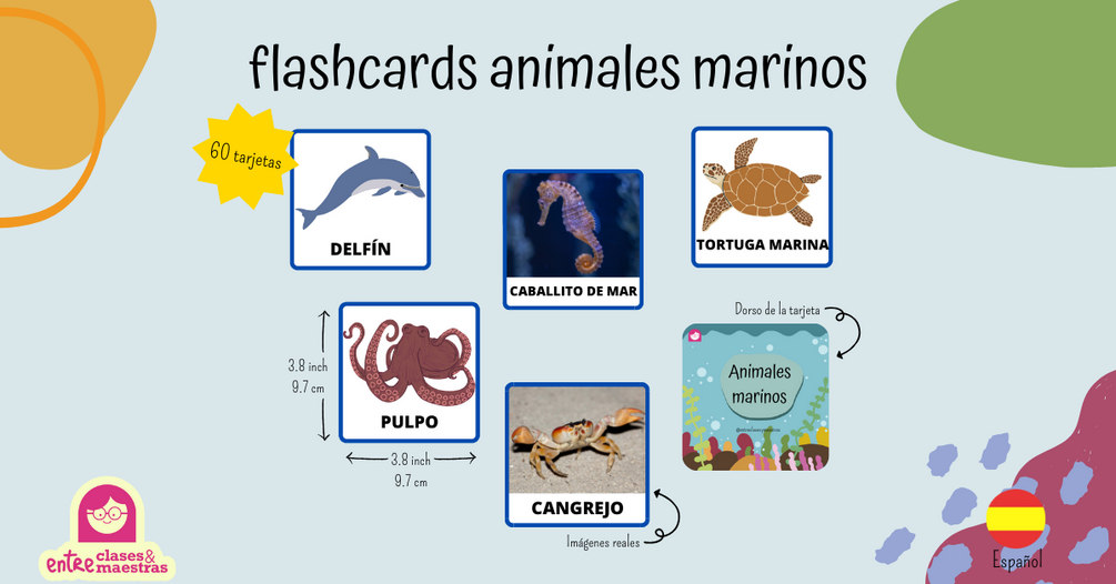 - 60 tarjetas con ilustraciones + imágenes reales a color de animales del mar.